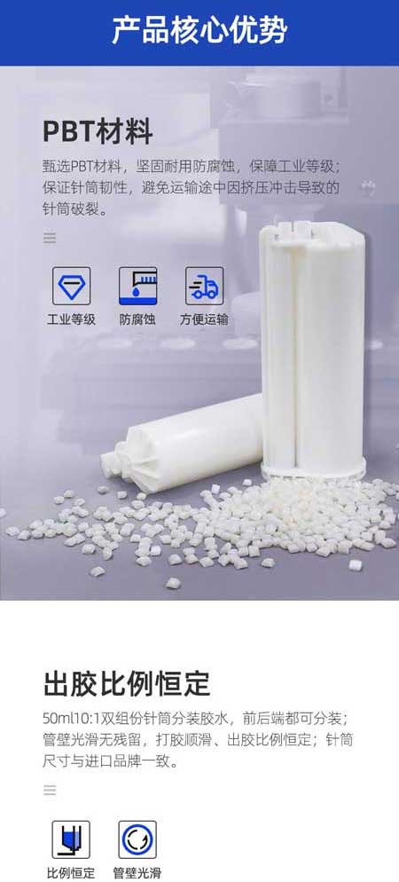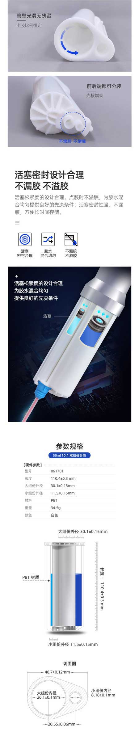 1、新款50ml10:1雙組份針筒采用PBT材料精制而成,